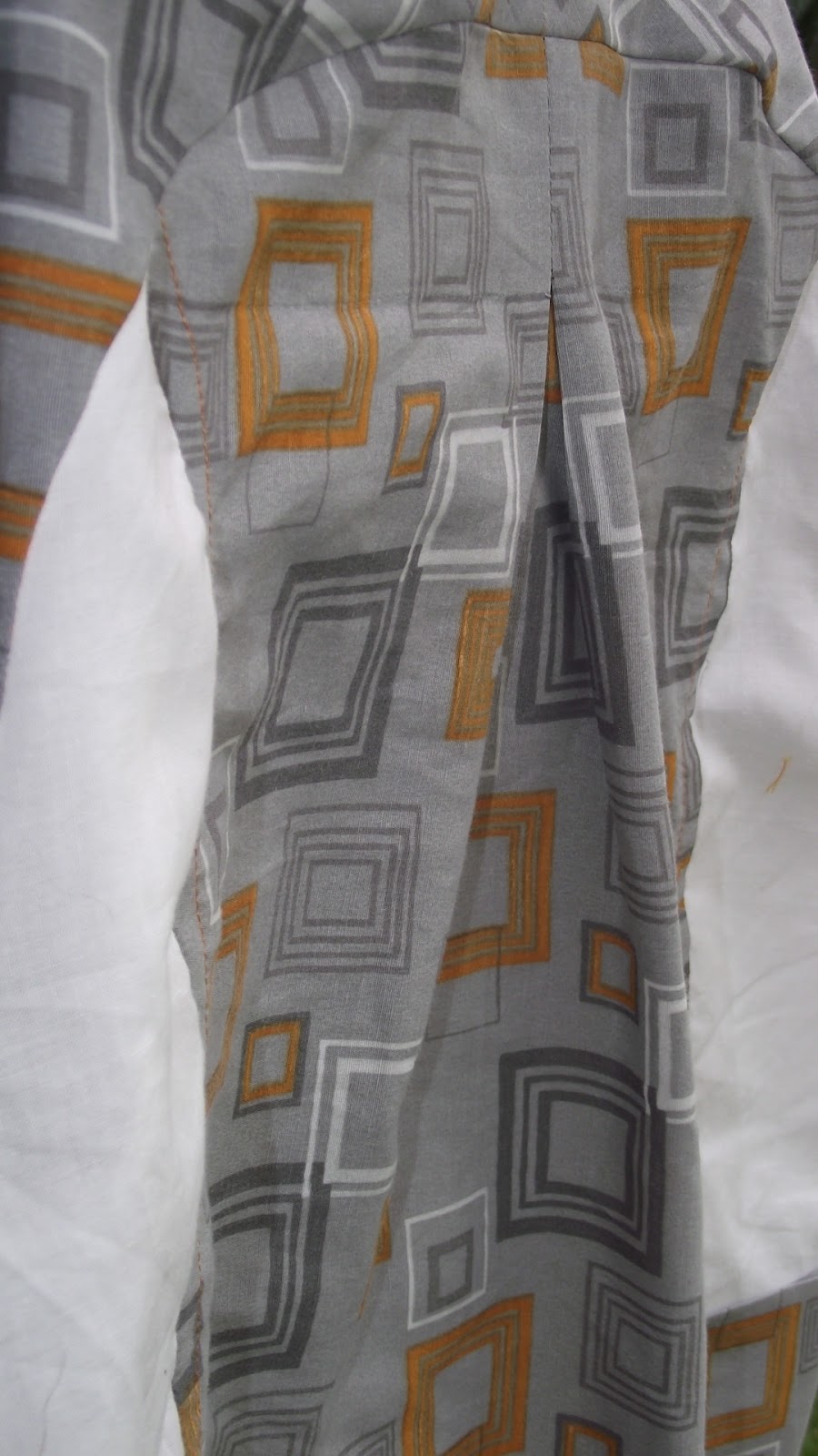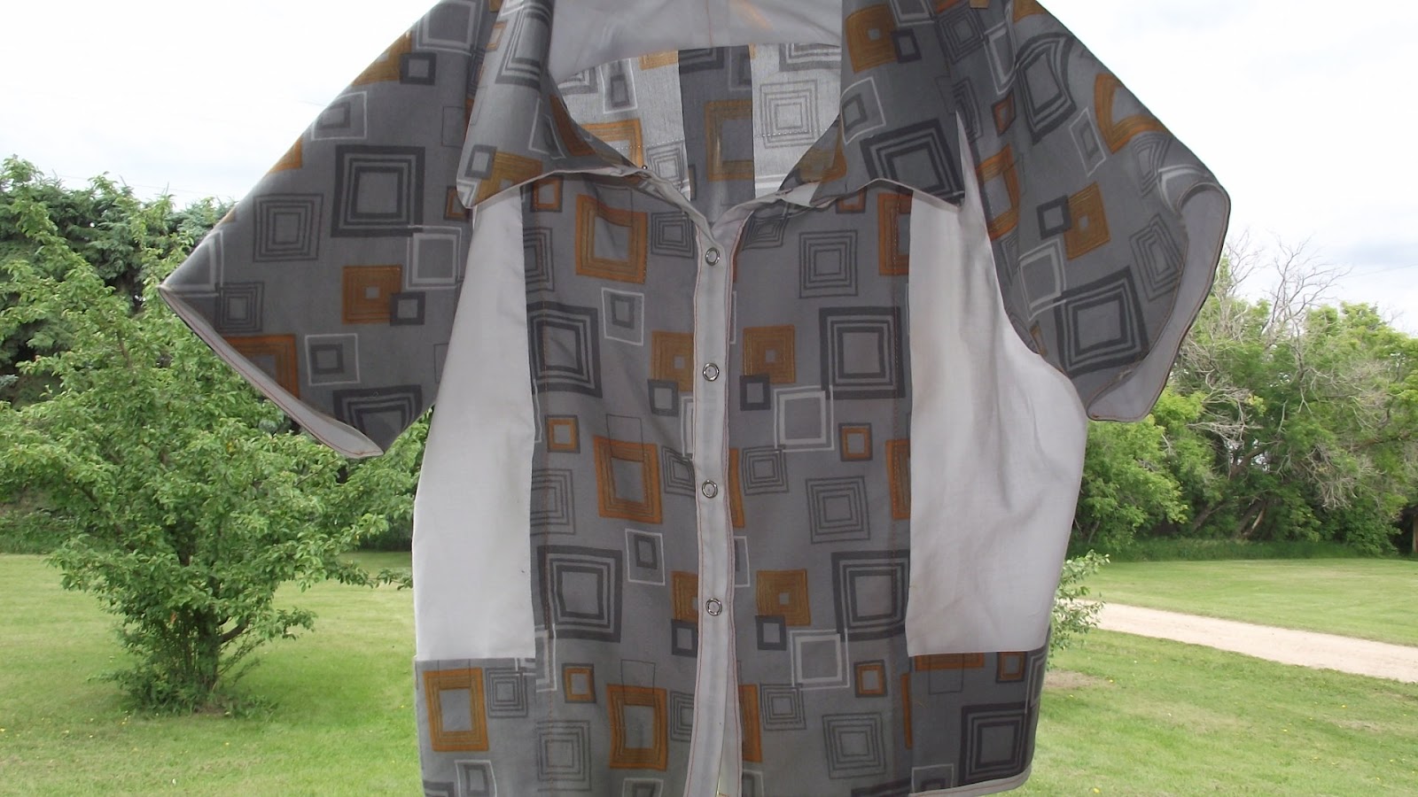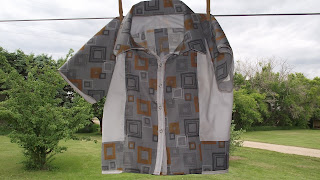 It was a lot of fun to sew--first time I did a collared shirt, and first time I actually made a button up shirt. And, the yoke was pretty neat as well. (I had wondered while cutting the pattern pieces why the sleeve pieces were so big, and then wondered what is a yoke?! Ha, yes it was a learning experience for me!) The fabrics are: the grey: a repurposed pillowcase that is a mix of cotton and polyester, and the white: a cotton from Walmart.