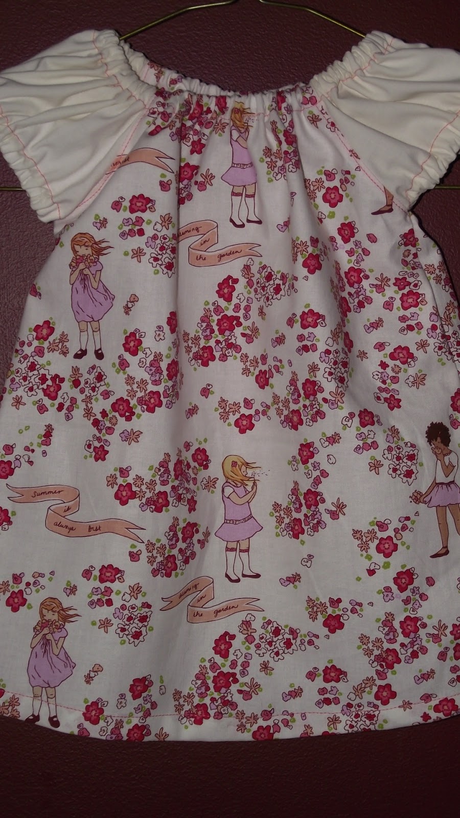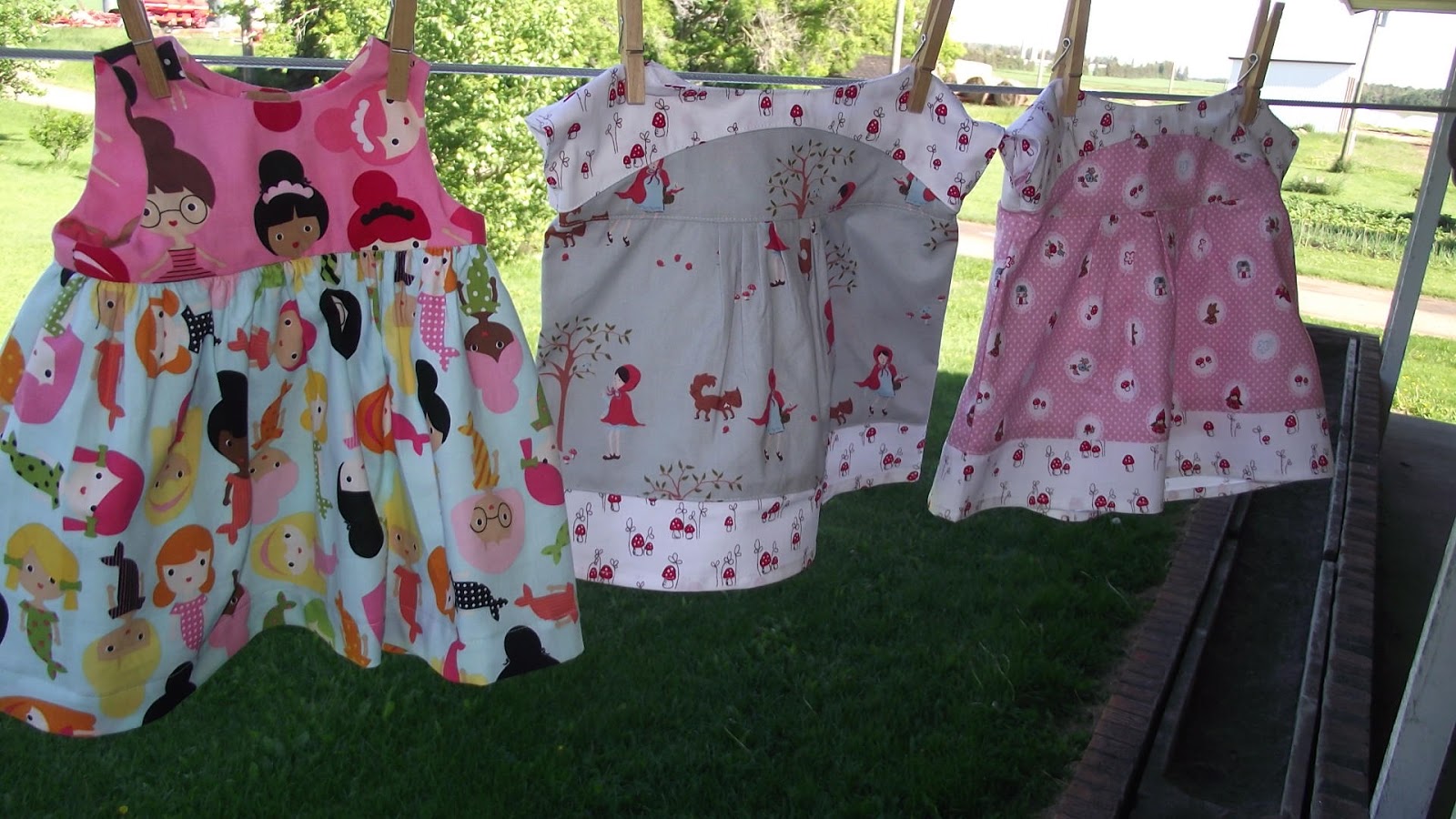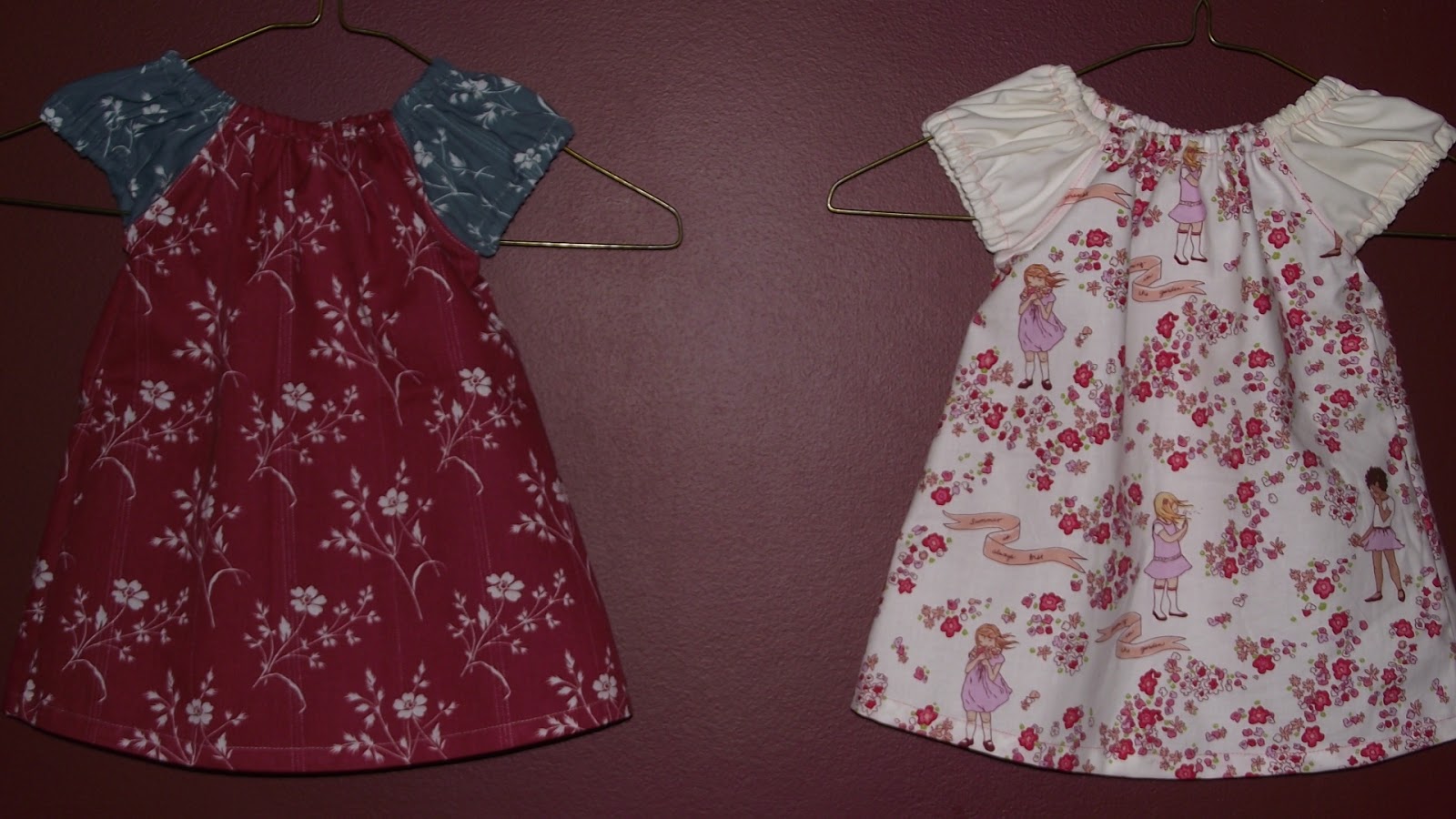 The oldest's are size 2/3 width but size 6/7 length. The next, I believe were also size 2/3 width but size 4/5 length. My daughter's I folded in the pattern to take it in, and the length is also 4/5. The youngest's I majorly took it in and guestimated where I should put the length. The two younger ones have a good sized hem. The older two have much smaller hems. Next time, I'll have to lengthen my oldest's.