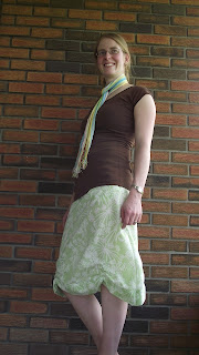 I threw in a second, above the knee length skirt to make the skirt modest--it's attached right at the waistband, with the side seams facing out to make it nice and comfy. And, that fabric was a long sleeved $3 tee from Walmart that I chopped up, so also a refashion!